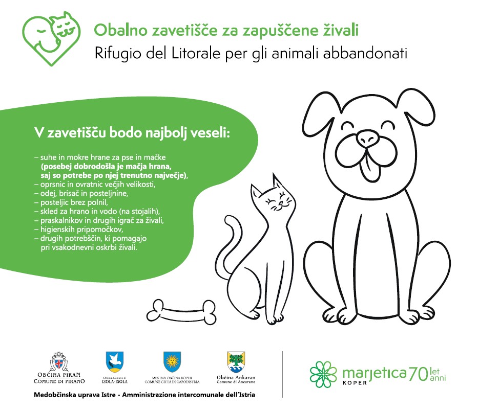 V mesecu aprilu in maju bo v organizaciji Medobčinske uprave Istre in Marjetice Koper potekala velika zbiralna akcija hrane in drugih potrebščin za Obalno zavetišče za zapuščene živali. Namen akcije je podpreti delovanje zavetišča ter izboljšati življenjske pogoje zapuščenih, najdenih in odvzetih živali na območju slovenske Istre.