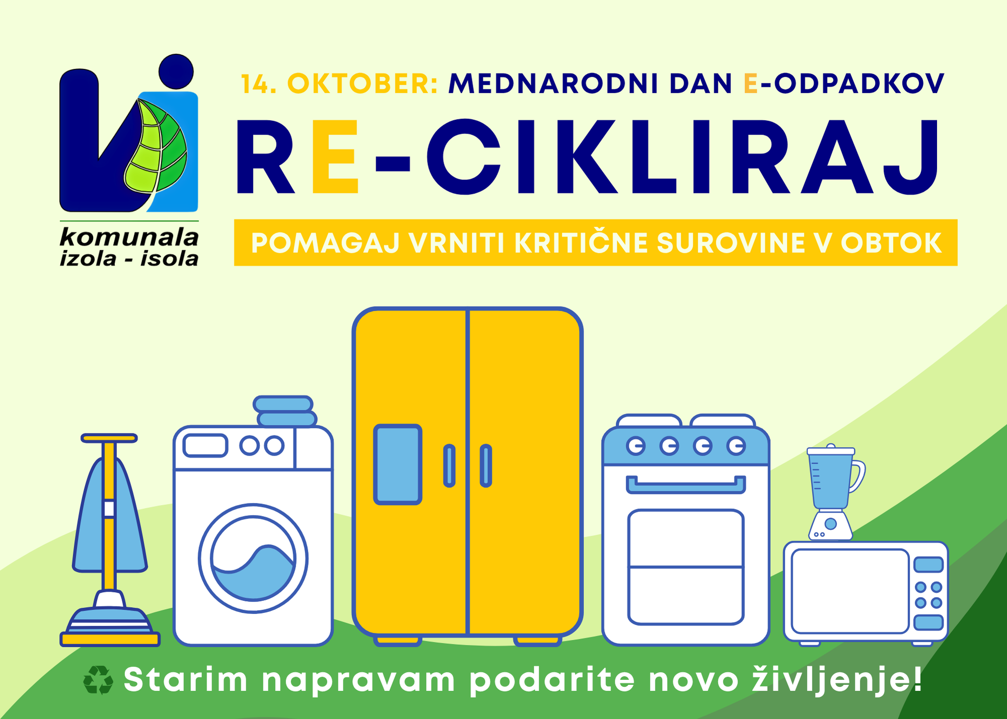 Ob mednarodnem dnevu e-odpadkov vas vabimo, da premislite, kaj se zgodi z vašimi starimi elektronskimi napravami. Ker je odlaganje e-odpadkov med mešane odpadke prepovedano, za njihovo pravilno oddajo izberite eno od sledečih možnosti, ki jih nudimo v Izoli. S tem boste prispevali k varovanju okolja in učinkovitemu recikliranju dragocenih surovin.
